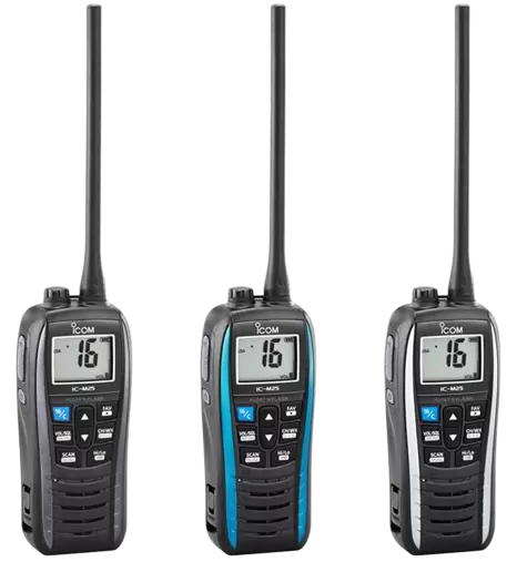 Three color options plus great features and style characterize the Icom IC-M25 marine VHF radio transceiver, which floats and flashes when dropped into the water. Sporting a slim design, this handheld device has the lightest body on the market for a .just 7.8oz floating VHF radio transceiver. New for an Icom marine handheld, this radio requires a USB connector for convenient charging from multiple electronic devices!